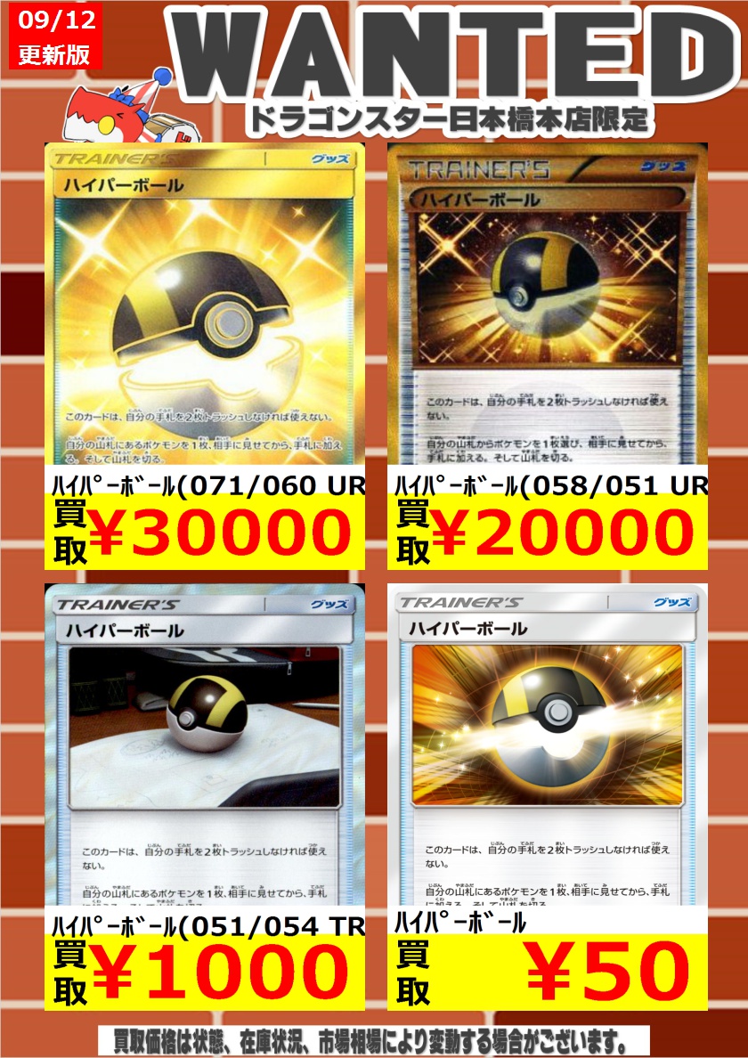 ポケモンカードの買取表を更新させていただきます!!1月5日現在※買取り価格はお店の在庫状況により変動することがございます。 ハイパーボール ミラー 30円 ur オクタン 1500円 レベルボール
